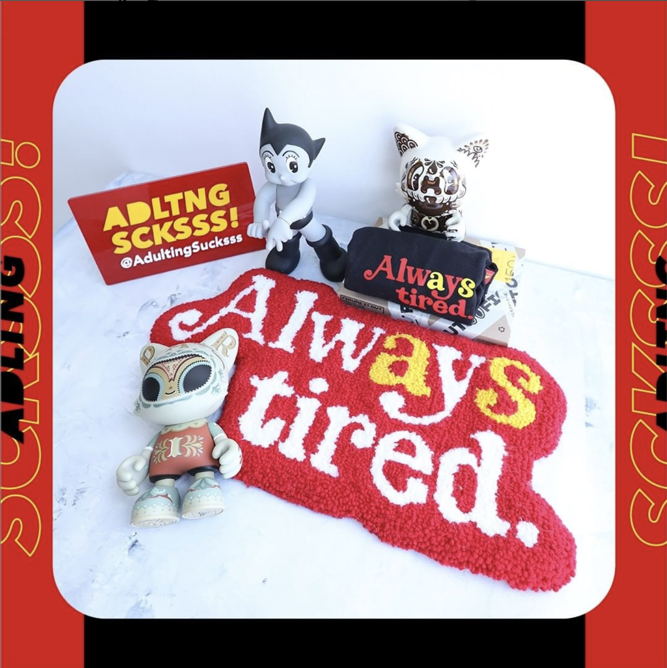 AQUÍ NACIÓ ADULTINGSUCKSSS DONDE SE COMBINAN SUS 2 PASIONES EL ARTE Y LOS JUGUETES DE COLECCIÓN, CUYO PROPÓSITO ES LLENAR DE ALEGRÍA A LAS PERSONAS CON JUGUETES COLECCIONABLES, SACÁNDOLOS DEL CAOS DE SUS DÍAS Y MANTENIENDO A SUS NIÑOS INTERNOS VIVOS.”